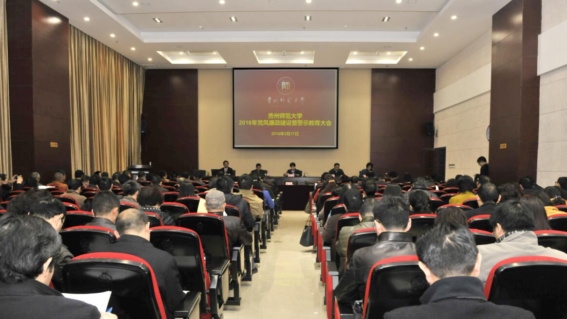 3月17日,学校在花溪校区行政楼主楼六楼多功能厅召开了2016年党风廉政建设暨警示教育大会。校党委书记韩卉出席并讲话。副校长刘肇军主持会议。副校长赵守盈、党委副书记银熙惠、纪委书记唐本文出席会议。学校中层副职以上干部参加会议。
