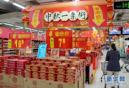 平价月饼渐成主流。在郑州市一家超市内,商家在显著位置摆放着售价7.8元的盒装月饼。新华社记者 李安